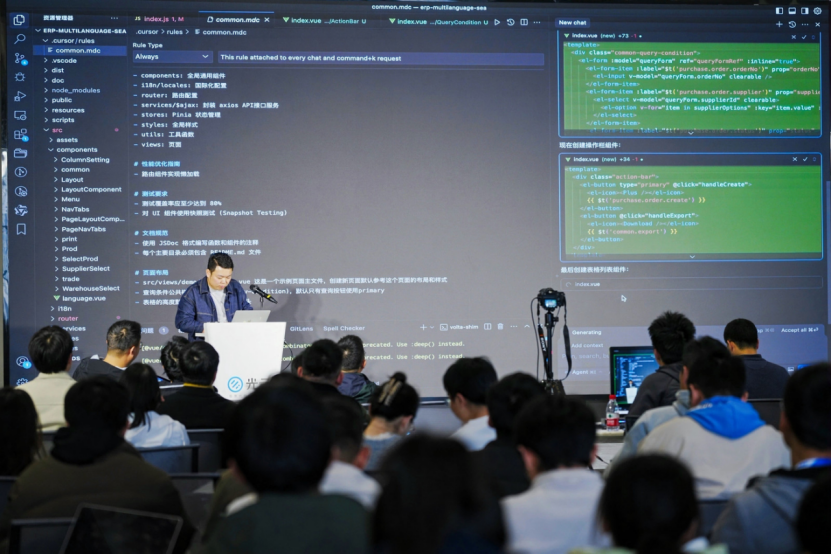 随后,旋乐吧spin8科技的工程师们进行了AI技术场景演示,诸多借助AI能力提高开发效率的成果得以共享。他们结合自身工作需求,对集成在AI编程工具中的通用模型进行多轮对话和调教,形成适配特定开发场景的小模型、工作流。